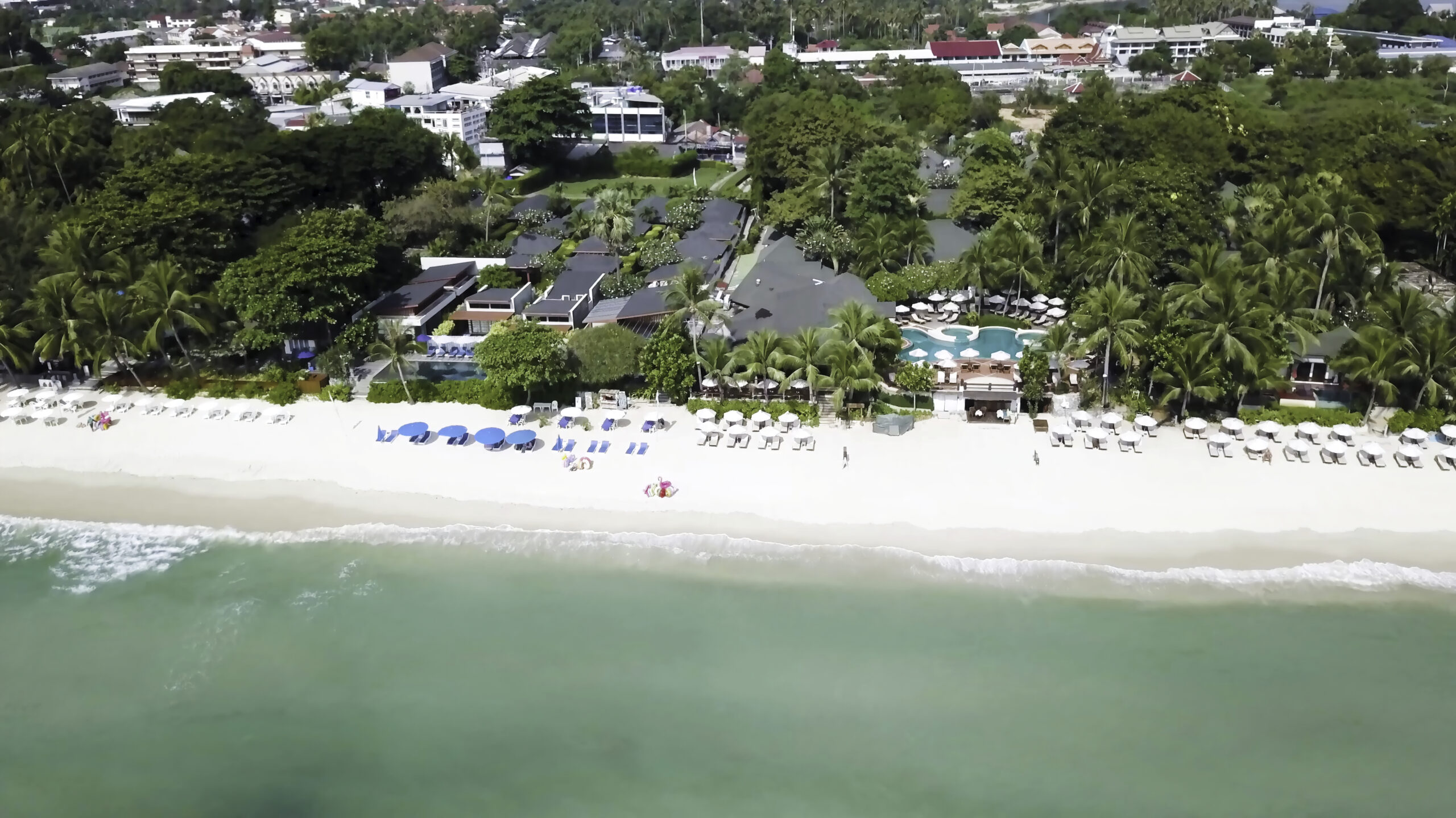 - Lush vegetation: Palm trees and tropical gardens line the beach